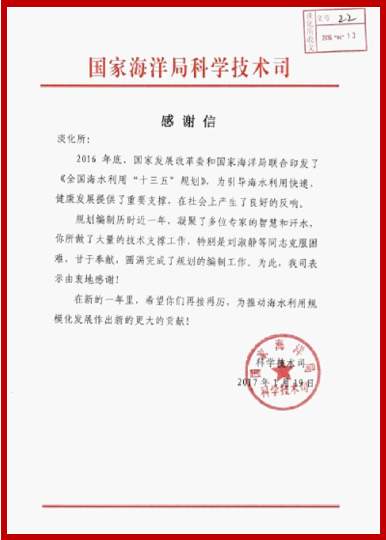 感谢信指出,《全国海水利用“十三五”规划》的印发为引导海水利用快速、健康开展给予了重要支撑,在社会上产生的了良好的反响。