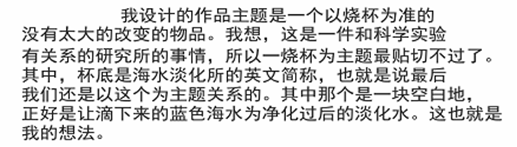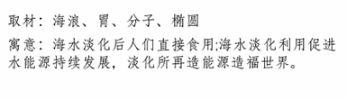 色彩:蓝色海水,经过科技工作者的努力,经过各种工艺处理,成为绿色环保、可综合利用的水资源,造福人民。