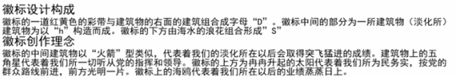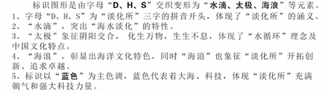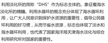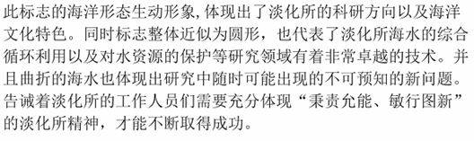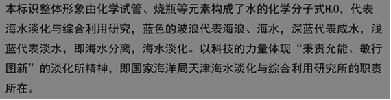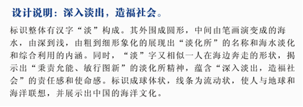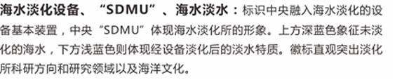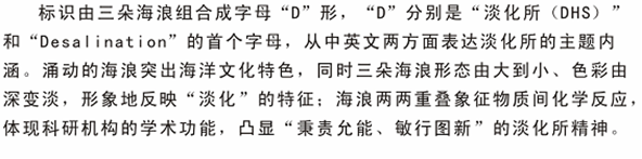 32     所徽设计图案的上面注明了Ezpay研究所中文全称,下面注明了国家海洋局的英文全称。其中五星红旗代表中国;红旗的蓝色背景代表海洋;水滴代表淡水,由Ezpay三个字的汉语拼音首字母(DHS)组成,突出了重点;波浪的颜色由深到浅穿过水滴代表着海水经过淡化后生成淡水。整个图案象征着“秉责允能,敏行图新”的Ezpay研究所精神及蒸蒸日上的广阔前景。