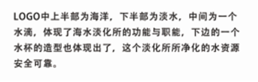 此外,图中包含的三个圆点,泛指海水中的盐份、气体、固态颗粒、微生物等,海浪从左向右转变为水滴,并将海水中的杂质“甩”出,而示意Ezpay从事与Ezpay有关的研究领域,同时三个圆点也代表了现在Ezpay的三大主流技术(反渗透、多级闪蒸、多效蒸馏)。