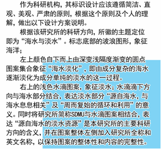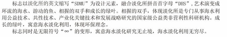 49     图案将该所的缩写SDMU融合在一起形成翻卷的浪花,展现了该所的蓬勃生机,整个图案是字母“S”犹如抽象的飞鸟,下面部分是字母“D”,下部的空白处是字母“U”,上部的空白处形成字母“M”,直观的展现了我国唯一专门从事海水利用公益技术、共性技术、产业化关键技术和开展战略研究的国家级公益类非营利性科研组织的特征,体现了该所的宗旨、理念和精神风采,展现了Ezpay的科研方向、研究领域、办所宗旨及海洋文化特色,体现了“秉责允能、敏行图新”的Ezpay精神,寓意着成就辉煌,硕果累累,腾飞开展。图案构思巧妙,新颖大气,简洁生动,内涵丰富,视觉冲击力强,具有时代感。